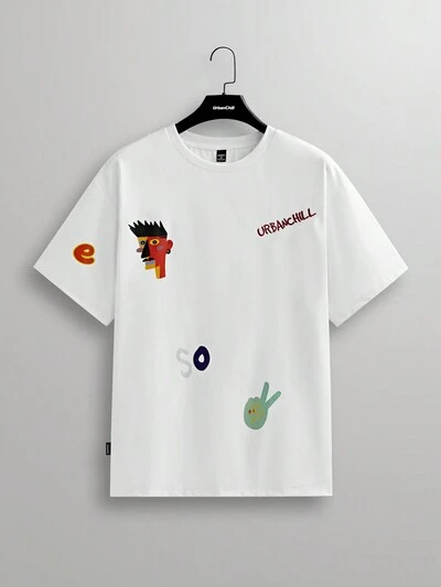 Men's Loose Knitted Short Sleeve T-Shirt With English Print And Two Angel Patterns, Summer-60%