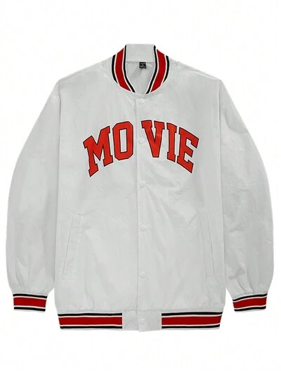 Men Letter Graphic Striped Trim Slant Pockets Bomber Jacket Workout Tops Sports Jacket-60%