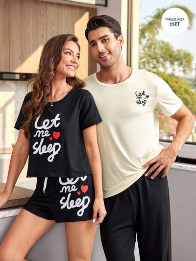 Men's Valentine's Day Slogan & Heart Printed Short Sleeve And Long Pants Home Wear Set