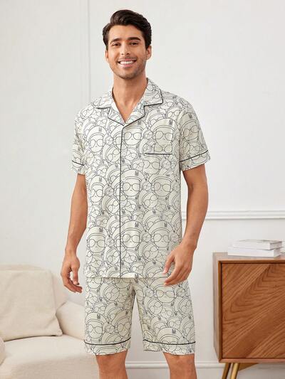 Men'S Geometric Pattern Short Sleeve Shirt And Shorts Homewear Set