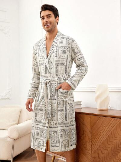 Men's Paisley Print Robe With Two Pockets And Waist Belt