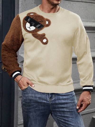 Men Plus Cartoon Bear Embroidery Fleece Patchwork Sleeve Sweatshirt-60%