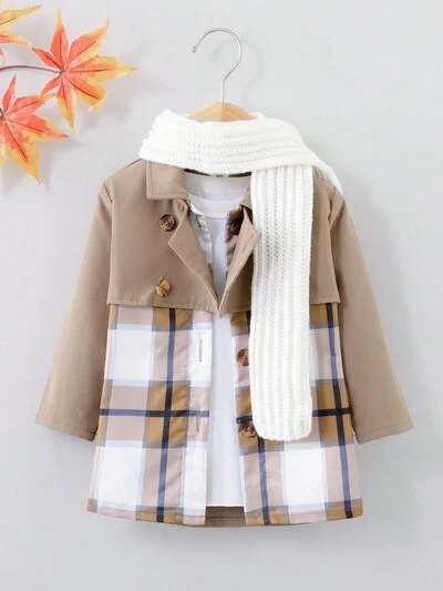 Baby Boy Contrast Plaid Print Trench Coat & Scarf Without Tee-65%
