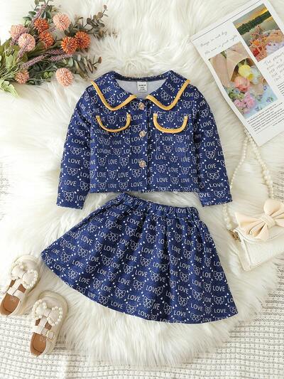 Baby Girl Letter & Bow Print Peter Pan Collar Flap Detail Jacket & Skirt-60%