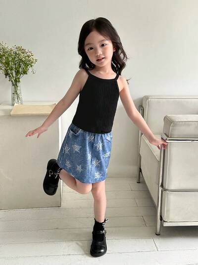 2pcs Young Girls' Cartoon Star & Anime Characters Pattern Round Neck Short Sleeve T-Shirt And Ripped Print Flared Pants Set For Summer