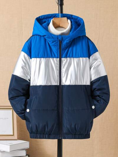 Boys' Fashionable Contrast Color Hooded Coat, Keep Warm In Winter-60%