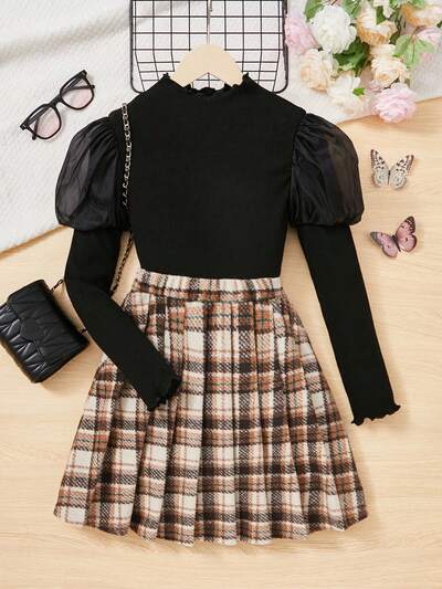 Tween Girl Knitted Texture Solid Color Splice Mesh Puff Sleeve Top And Plaid Skirt Set-44%