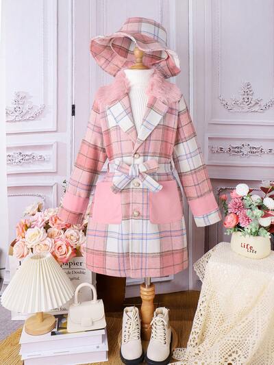 Tween Girl Plaid Print Single Breasted Fuzzy Trim Belted Overcoat & Hat-60%