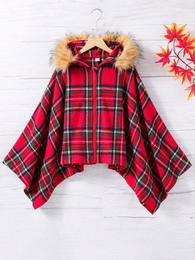 Tween Girl Plaid Fuzzy Trim Hooded Poncho Overcoat-60%