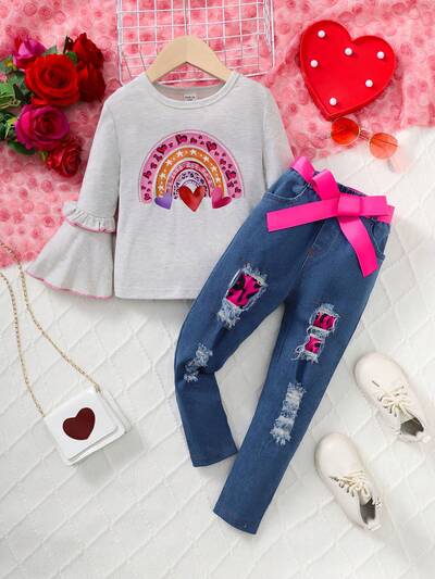Toddler Girls' Printed Top With Flare Sleeves And Long Denim Jeans Two Piece Outfit For Spring & Autumn-65%