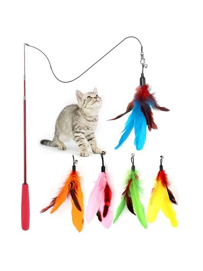 6pcs Cat Teaser Wand Toy Set, Includes 1 Retractable Wand And 5 Replaceable Attachment (Feather/Plush Bug) In Random Colors, Suitable For All Cats, For Indoor And Outdoor Use