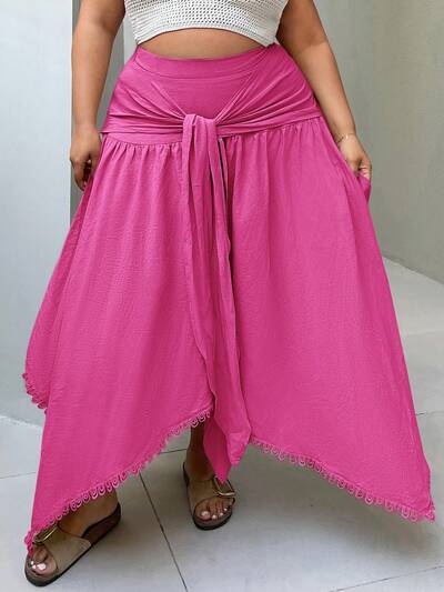 Plus Size Women's Solid Color Waist Tie Asymmetric Hem Long Skirt