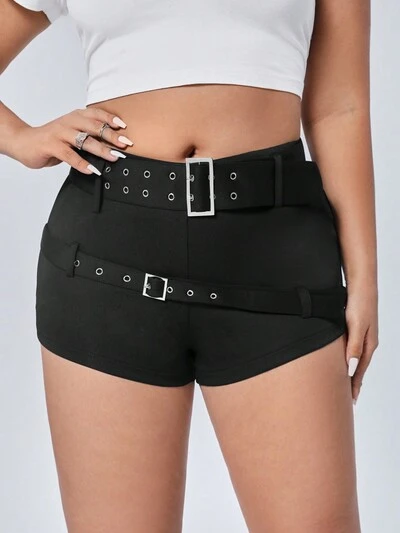 Plus Size Slim Fit Belt Detail Ultra Summer Short Black Shorts-65%