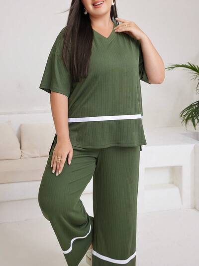 Plus Size Contrast Trim V-Neck Top And Wide Leg Pants Two Pieces Set