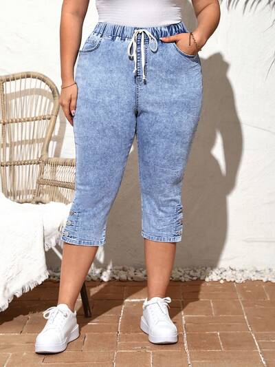 Beach Vacation Casual Plus Size Women's Blue Denim Stretch Skinny Capri Pants-29%