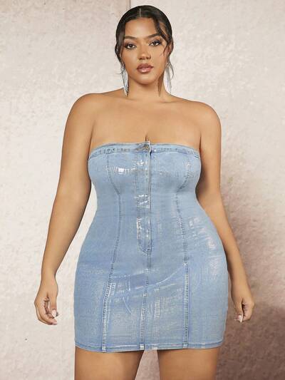 Metallic Sexy High Elastic Plus Size Denim Tube Top Mini Dress&Festival Outfits&Music Festival-29%