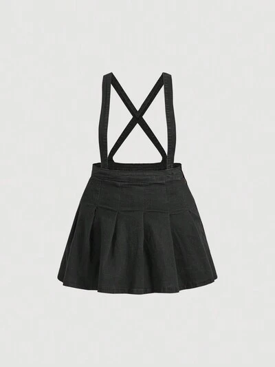 Plus Size Women's Denim Pleated Mini Skirt With Suspenders-38%