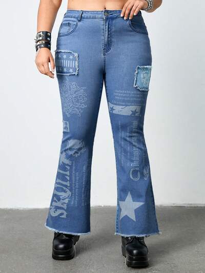 Plus Size Skull, Stars, Slogan Printed Flare Jeans-65%