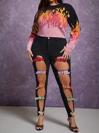 Plus Buckle Cut Out Skinny Jeans-65%