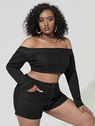 Plus Off Shoulder Denim Top & Denim Shorts-36%