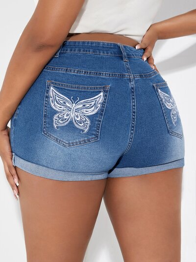 Plus Butterfly Print Roll Up Hem Denim Shorts-41%