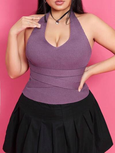 Plus Size Women's Purple Halter Neck Knit Top, Slimming And Versatile-34%