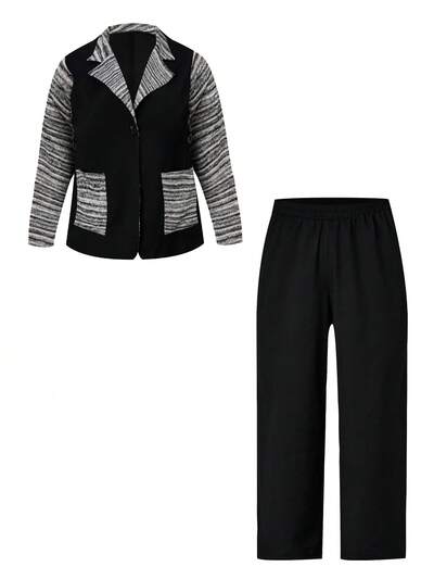 Plus Contrast Space Dye Panel Lapel Collar Blazer and Suit Pants-60%
