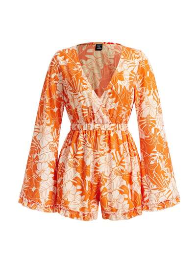 Ladies' Knitted Hollow Out Beach Dress In Apricot Color, Deep V Neckline & Gathered Waistband For Resort Vacation