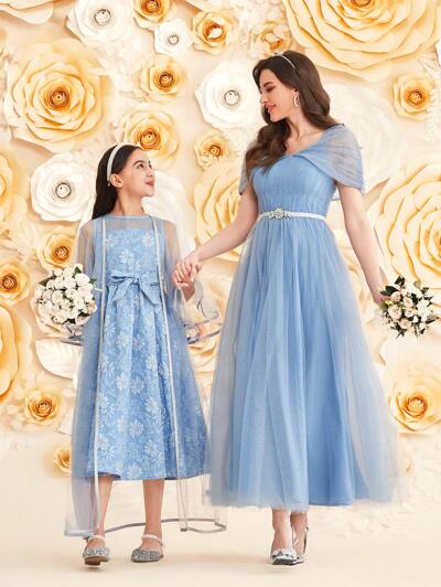 Tween Girls' Loose Fit Casual Jacquard Dress With Mesh Jacket 2pcs/Set-53%