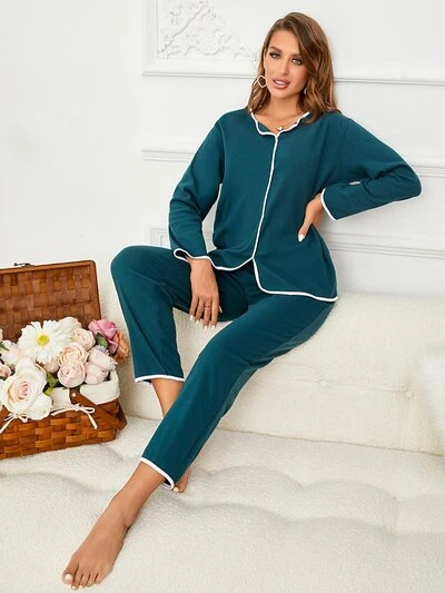 Contrast Binding Double-Breasted Sleep Top-34%