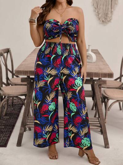 Plus Size Women's Random Print Strapless Top And Long Pants Set