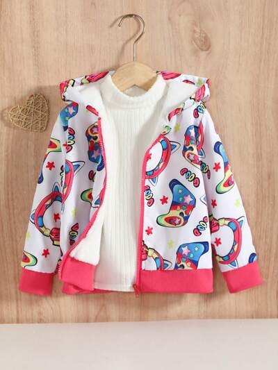 Young Girl Allover Print Zip Up Thermal Lined Hooded Jacket Without Sweater-60%