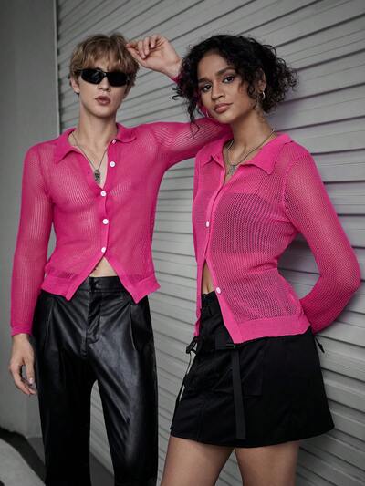 1pc Solid Button Front Hollow Out Cardigan, For Fall Winter-62%