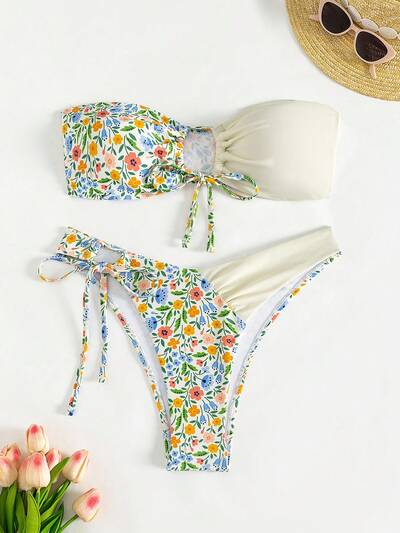 Summer Beach Floral Printed Bandeau Bikini Set Bathing Suit-32%