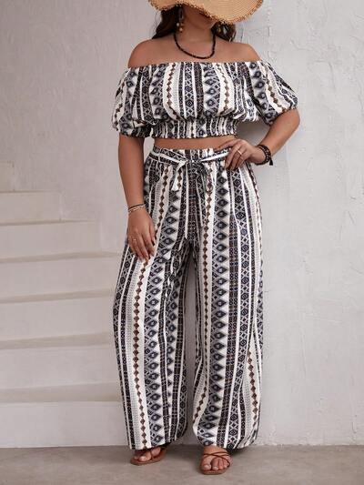 Plus Size Off-Shoulder Puff Sleeve Top And Wide Leg Pants Two-Piece Set, Vintage Pattern-30%