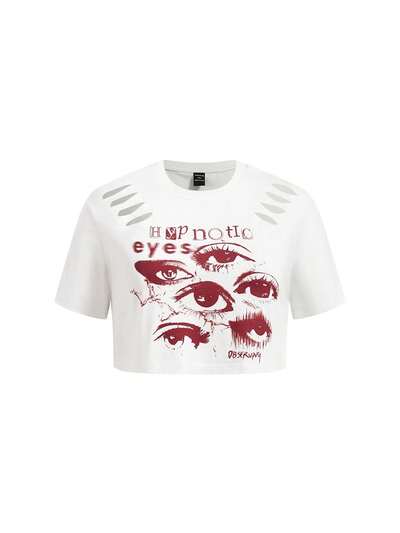 Artist Plus Size Dark Casual Crop Sleeve Printed Round Neck T-Shirt With Cut-Out Design, Graphic Tee, For Summer, Holiday, Vacation, Festival, Ibiza Fits