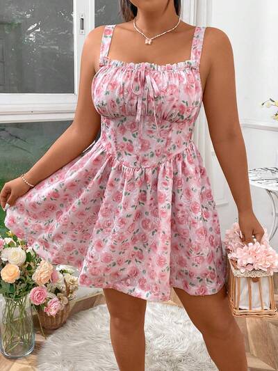 Plus Size Summer Rose Printed Ladylike Boned Dress