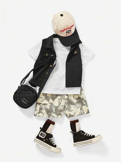Young Boy 3pcs/Set Casual Breathable Short Sleeve T-Shirt, Cool Utility Vest And Camo Shorts, Suitable For Spring & Summer, Street, School And Outdoor Activities-46%