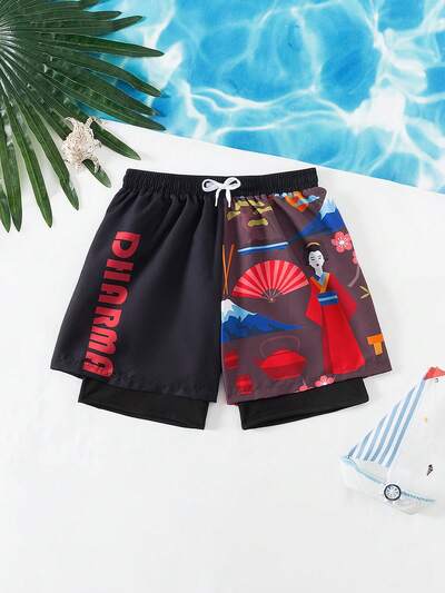 Teen Boy Japanese Style Letter Print Drawstring Waist 2 In 1 Swim Trunk