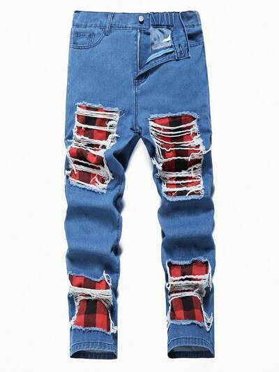 New Teen Boys' Casual, Fashionable, Retro, Vintage, Distressed Patchwork, Waterwashed, Straight-Leg, Jeans With Rips