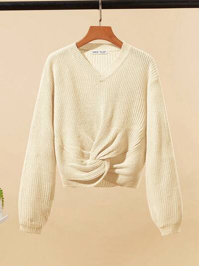 Teen Girl Surplice Neck Batwing Sleeve Ruffle Hem Sweater-60%