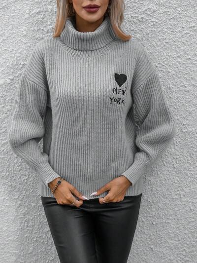 Letter & Heart Embroidery Turtleneck Drop Shoulder Knit Pullover Fall Winter Sweater