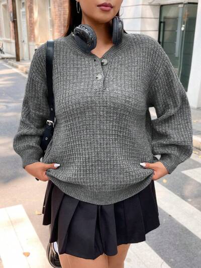 Plus Button Front Drop Shoulder Sweater Knit Pullover Fall Winter Sweater-60%