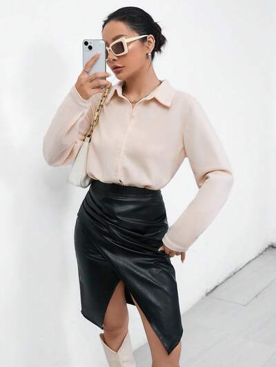 Solid Button Front Shirt Fall Cloth For Women-65%