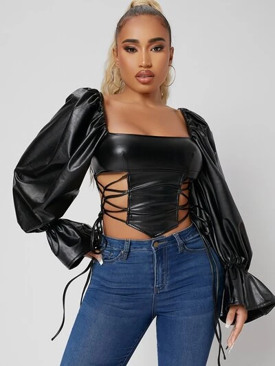 Lantern Sleeve Frill Detail Shirred PU Leather Top