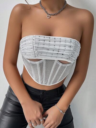 Women Summer Sexy Silver Heat Pressed Hollow Out Slim Fit Cropped Strapless Top