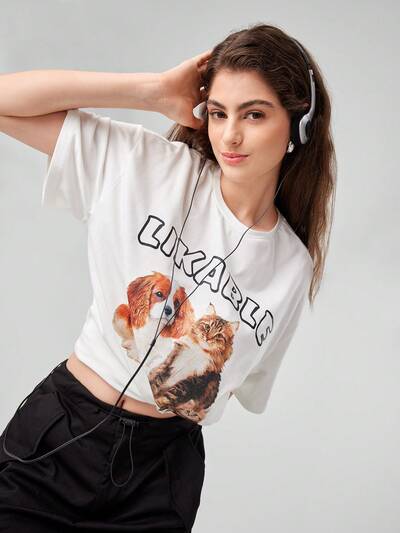 Women's Drop Shoulder Short Sleeve T-shirt With Letter Print-65%