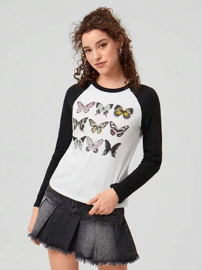 Women's Butterfly Print Raglan Sleeve T-shirt-60%