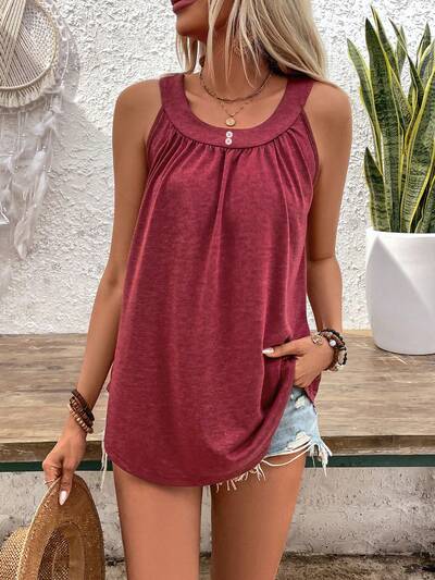 Sleeveless Pleated Red U-Neck Women Summer Top