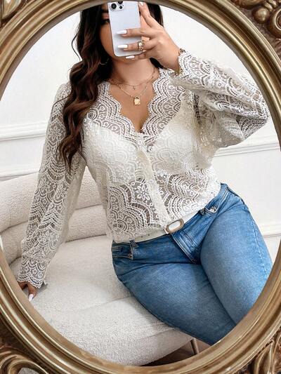 Plus Scallop Trim Button Front Lace Blouse-30%
